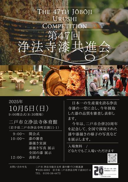 おしらせ 2025年10月5日に、第47回浄法寺漆共進会を開催します。 2025年9月5日 2025年9月8日 jobojiurushi-Administrator 今年も共進会を開催します。 「共進会」とは品評会のようなもので、今年は盛辺(さかりへん)、末辺(すえへん)の部で、優れた品質の漆を採った職人を表彰します。 浄法寺漆としての品質を保ち、技術や経験の継承の場としても大切な場となっています。 2025年10月5日(日)の9時から、二戸市立浄法寺体育館にて開催し、どなたでもご覧いただけますのでご興味あります方はぜひご覧いただければと思います。 \ 詳細はこちらから/うるしの國・浄法寺2025年 共進会のおしらせ 昨年の様子